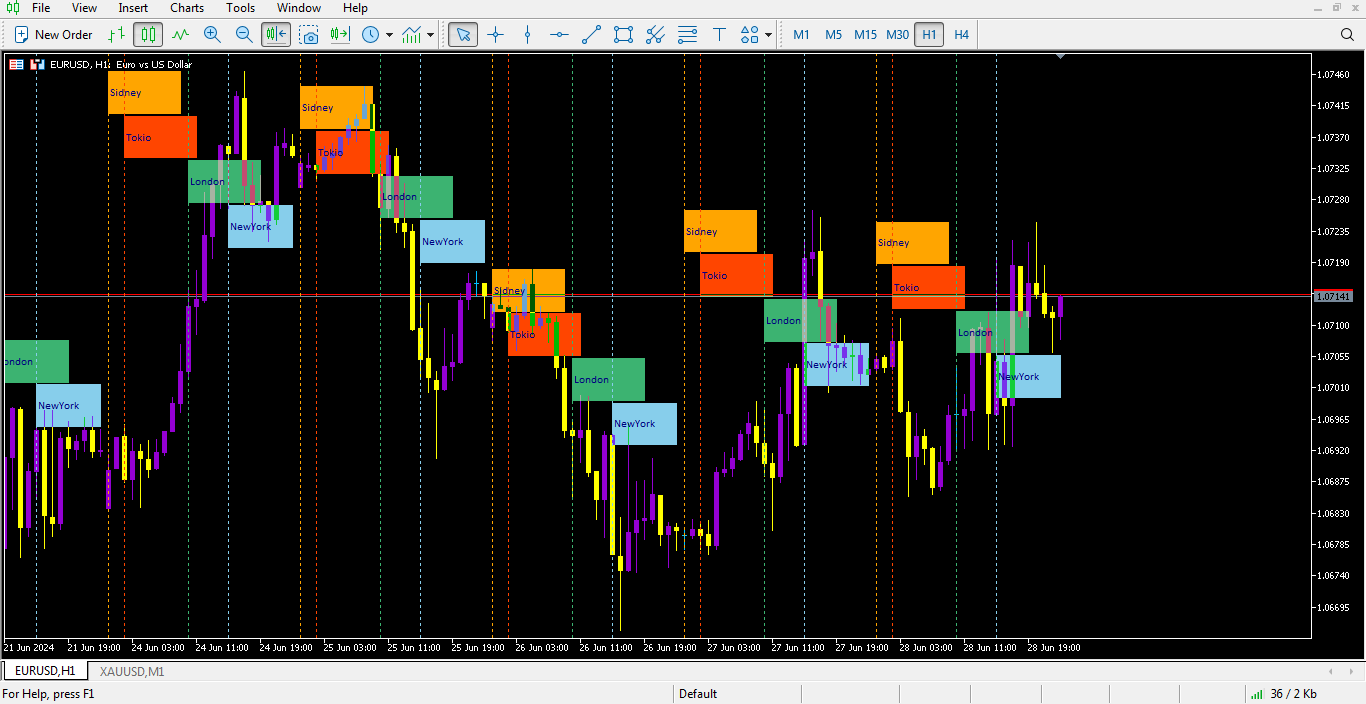 اندیکاتور سشن با ترسیم گرافیکی سشنهای مختلف بازار، از جمله آسیا، اروپا و آمریکا، به صورت رنگی و مجزا روی نمودار، به معاملهگر این امکان را میدهد که دقیقاً بداند در چه بازه زمانی از بازار قرار دارد. این ویژگی بهویژه برای کسانی که به زمانهای خاصی از بازار وابسته هستند، بسیار مهم است؛ زیرا هر سشن ویژگیهای رفتاری خاص خود را دارد و نمایش بصری این سشنها به درک بهتر این تفاوتها کمک میکند.
